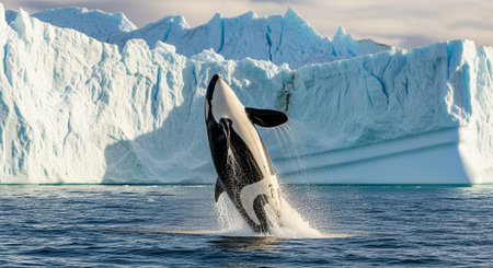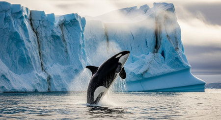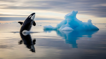 A majestic orca breaching out of the calm ocean water near a large blue iceberg. The soft lighting of the sky reflects on the water's surface, highlighting the beauty of the arctic wildlife.
