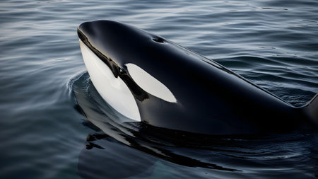 A dramatic close-up captures the head of an Orca, or killer whale, as it surfaces to breathe in dark, calm waters. The sleek black and white skin of the marine mammal glistens against the deep blue ocean, highlighting its power and elegance in the wild.
