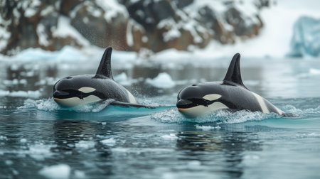 Majestic Orca Whales Leaping in the Arctic Ocean. Generative ai. High quality illustration