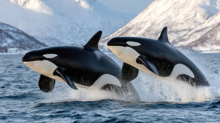 Two black and white killer whales are captured mid-air as they leap out of dark blue, choppy water, creating significant white splashes. The background features towering, snow-covered mountains under what appears to be bright daylight, suggesting a cold, northern latitude marine environment.