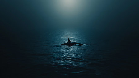 Orca whale jumping in calm ocean with foggy background, creating minimalist and serene atmosphere