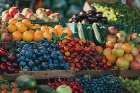 Vendors display vibrant fruits for customers at a bustling market on a sunny afternoon, promoting local produce.