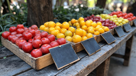 Vibrant heirloom tomatoes and ripe watermelons nestled in weathered wooden bins evoke a rustic market ambiance, perfect for healthy lifestyle themes.