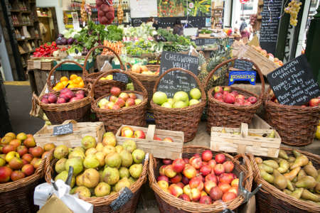 London, UK - September 07, 2019: Fresh fruits in wooden crates on sale at Spitalfields Market, one of the finest surviving Victorian Market Halls in London with fashion, antiques and food stalls.