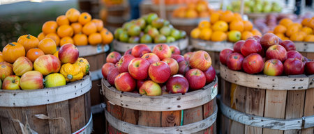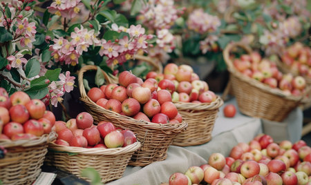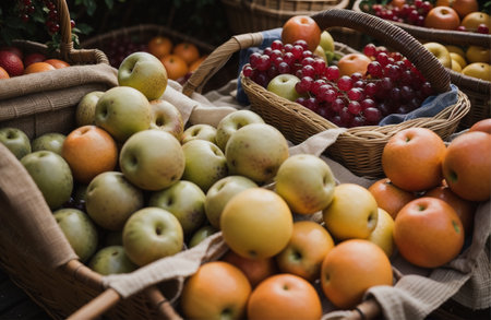 Apples, pears and persimmons in vintage baskets on a street market