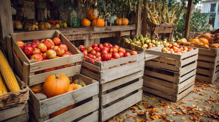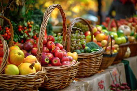 Fruits and vegetables for sale on street stall in the market. Ripe organic apples and corn in wicker baskets in local farmer market. Small business. Homegrowing produce. Traditional agricultural fair.