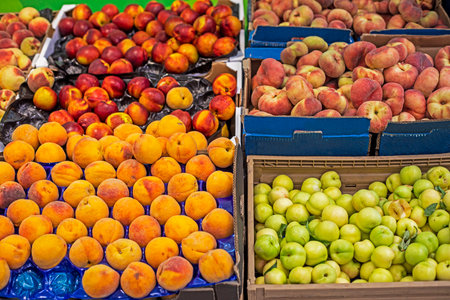 ripe peaches of different varieties in bulk in a container in a supermarket