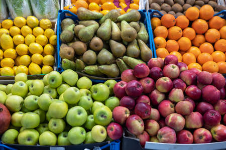 Apples, oranges, lemons and pomegranate at local farmer's market in Beziers, Occitanie region of France.