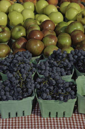 Fresh Ripe Fruits At A Farmers Market. Grapes, Apple, Oranges.