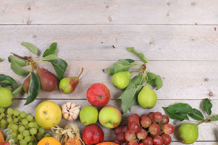 Fruits and vegetables mix in the form of a frame on a wooden background with space for inscription