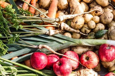 Collection of freshly harvested carrots, potatoes, celeriac, cucumber and leeks