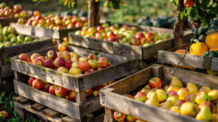 Juicy green and red apples arranged in a weathered wooden box, accented by fresh herbs, sun-ripened tomatoes, crisp green fruits, and plump purple grapes, creating a live