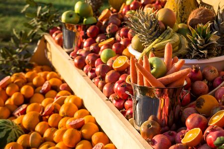 Tropical fruits for making freshly squeezed juice right at the counter. Exotic market with oranges, melon, pomegranates