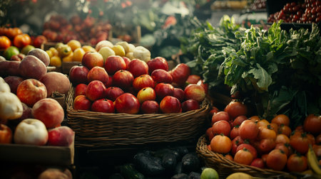 an assortment of ripe fruits and vegetables in a baskets at the farmer's market