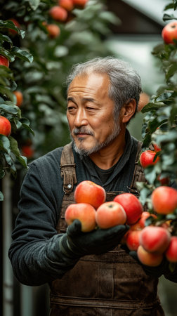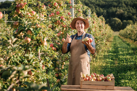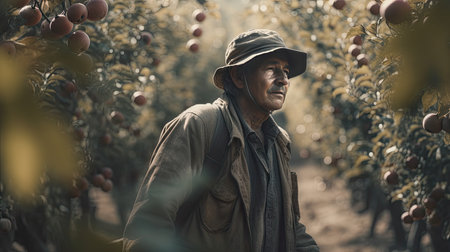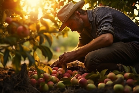 A male worker is tending the apple harvest. that were created by realistic Generative AI