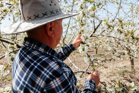 caucasian senior man farmer working analyze the flowers on the fruit tree in orchard. Portrait of senior man with hat in his organic garden, real people