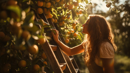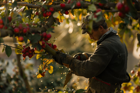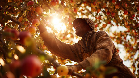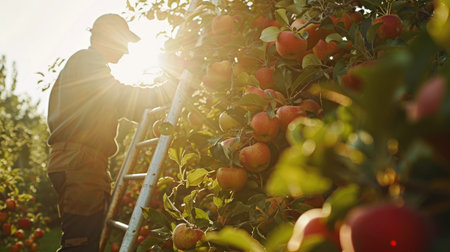 An orchard worker standing on a ladder, carefully selecting ripe apples, with sunlight creating a warm glow around the tree branches and fruit