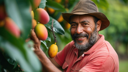 man in brown cap with hat and red polo shirt holding a mango tree, in the style of joyful