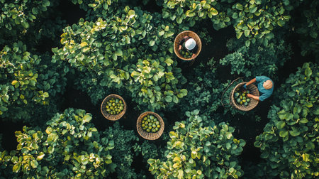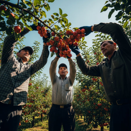 Cinematic low angle of farm laborers collaboratively picking ripe fruit in a sun-drenched orchard.