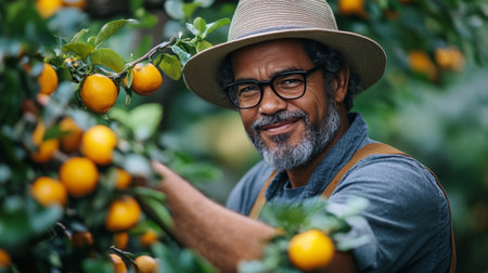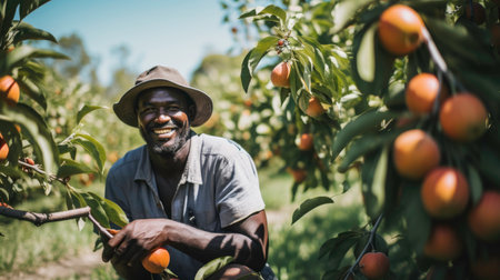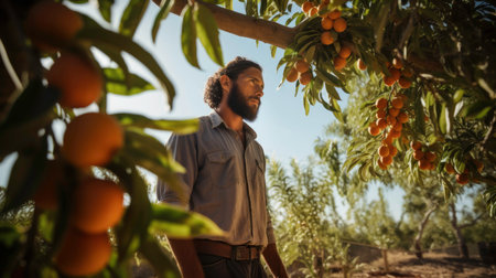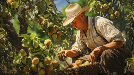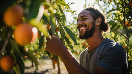 Farmer Harvesting Fruits in Sunlit Orchard