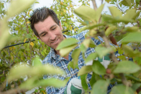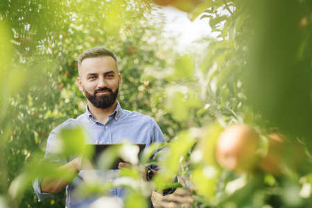 Happy farmer checking on his apple trees in the orchard
