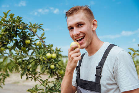 Caucasian male farmer in an apple orchard picking ripe apples. Concept of agriculture, harvesting, farming, rural farming life.