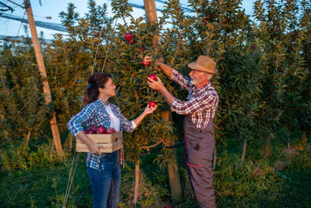Two farmers father and daughter harvesting red apples in orchard in early autumn