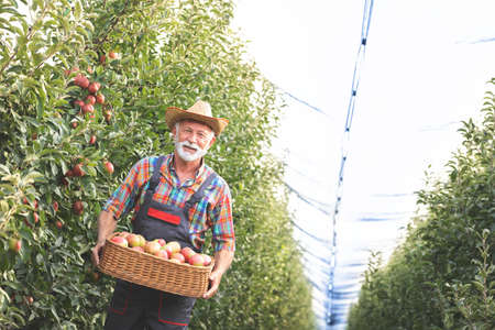 Smiling senior man holding a basket full of apples and carried through the orchard