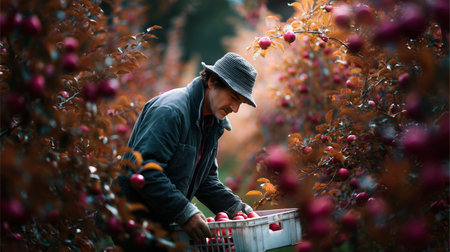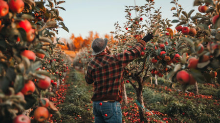 A farmer picks ripe apples from trees under the warm sunlight in a lush orchard, surrounded by the colorful autumn foliage showing the harvest season.