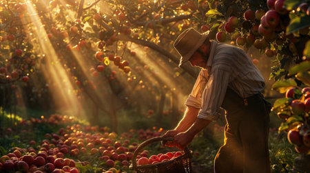 A farmer picking apples in a sunlit orchard, with rays of sunlight filtering through the trees, creating a warm and inviting atmosphere as the farmer fills a basket with fresh apples