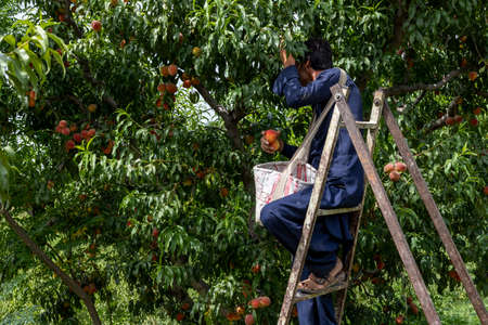 Man working in peach fruit farm harvesting peaches from trees