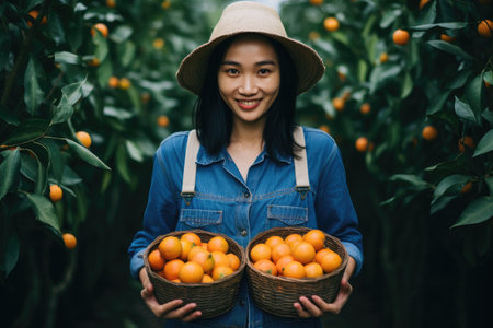 A woman stands holding two baskets filled with ripe oranges, Female farmer with hands holding freshly harvested mandarin oranges, AI Generated