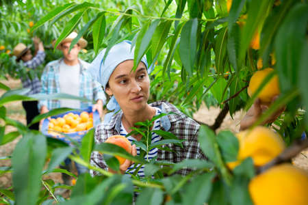 Positive woman harvesting ripe peaches in his orchard on day