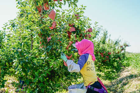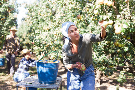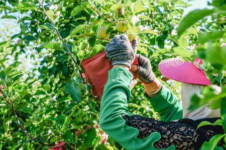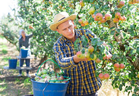 Farmer harvesting apples in his orchard. Selective focus.