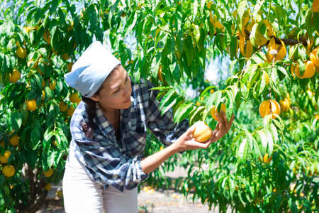 Woman engaged in gardening, picking fresh ripe peaches in orchard