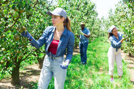Female farmer picking ripe pears in orchard