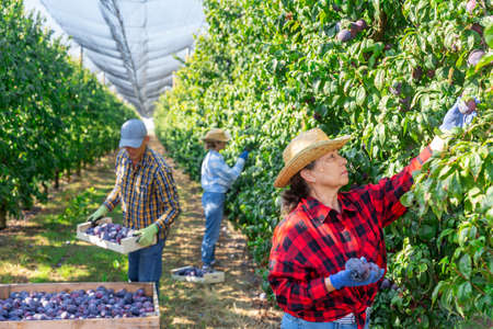 Farmers picking ripe plums in fruit garden
