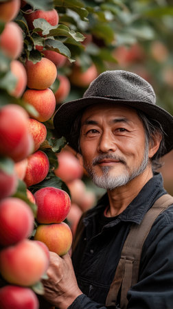 Senior farmer smiling in an apple orchard during harvest season