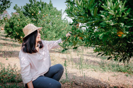 Farmer Woman is Harvesting Picking Oranges Fruit in Organic Farm. Cheerful Attractive Farmer Woman is Working in Orange Plantation Farming. Agriculture Lifestyles and Orange Plantation Orchard