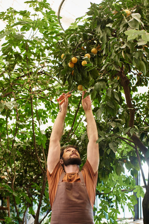bearded gardener in linen apron cutting branch on tree with gardening scissors in greenhouse