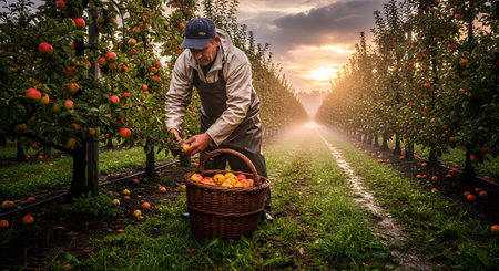 A farmer harvesting ripe red apples into a woven basket in an orchard during the golden hour. Rows of apple trees laden with fruit stretch into the misty background, highlighting agricultural labor.