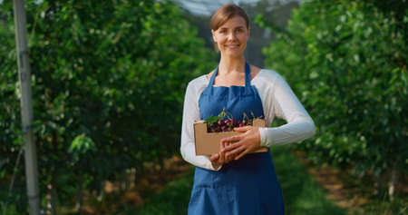 Garden woman holding box at agriculture organic cherry tree farm. Young female entrepreneur presenting harvest at modern sunny agriculture farm in harvest season in summer. Cherry berry farm concept.