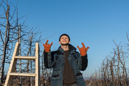 Waist up portrait of the young happy man gardener, dressed in black hat, blue jacket and orange work gloves stands with closed eyes among his garden near the wooden stepladder and shows rock and roll sign, gesture