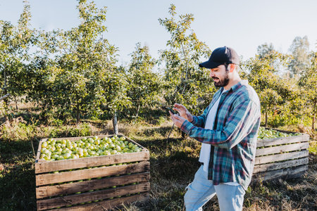 Young latin farmer man using his phone beside apple plantation. Agricultural concept. Digital nomad