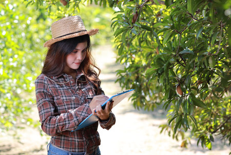 Asian agronomist or woman farmer reading report and inspecting growing crops data from clipboard for increasing productivity in agriculture field, modern smart farming with technology concept