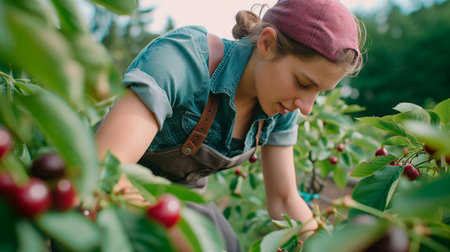 Young woman working on cherry picking on a sustainable farm. Organic farming, international environment day