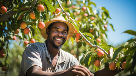 photo of a modern farmer picking fresh peaches