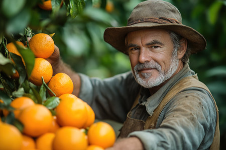 Farmer man harvesting oranges in an orange tree field
