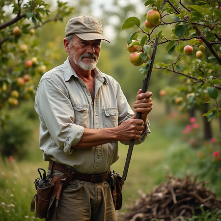 Senior well-dressed man as a gardener pruning branches of a fruit trees in the apple orchard. Concept of a fruit gardening on retirement age