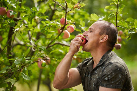 happy man picking red apples in apple orchard